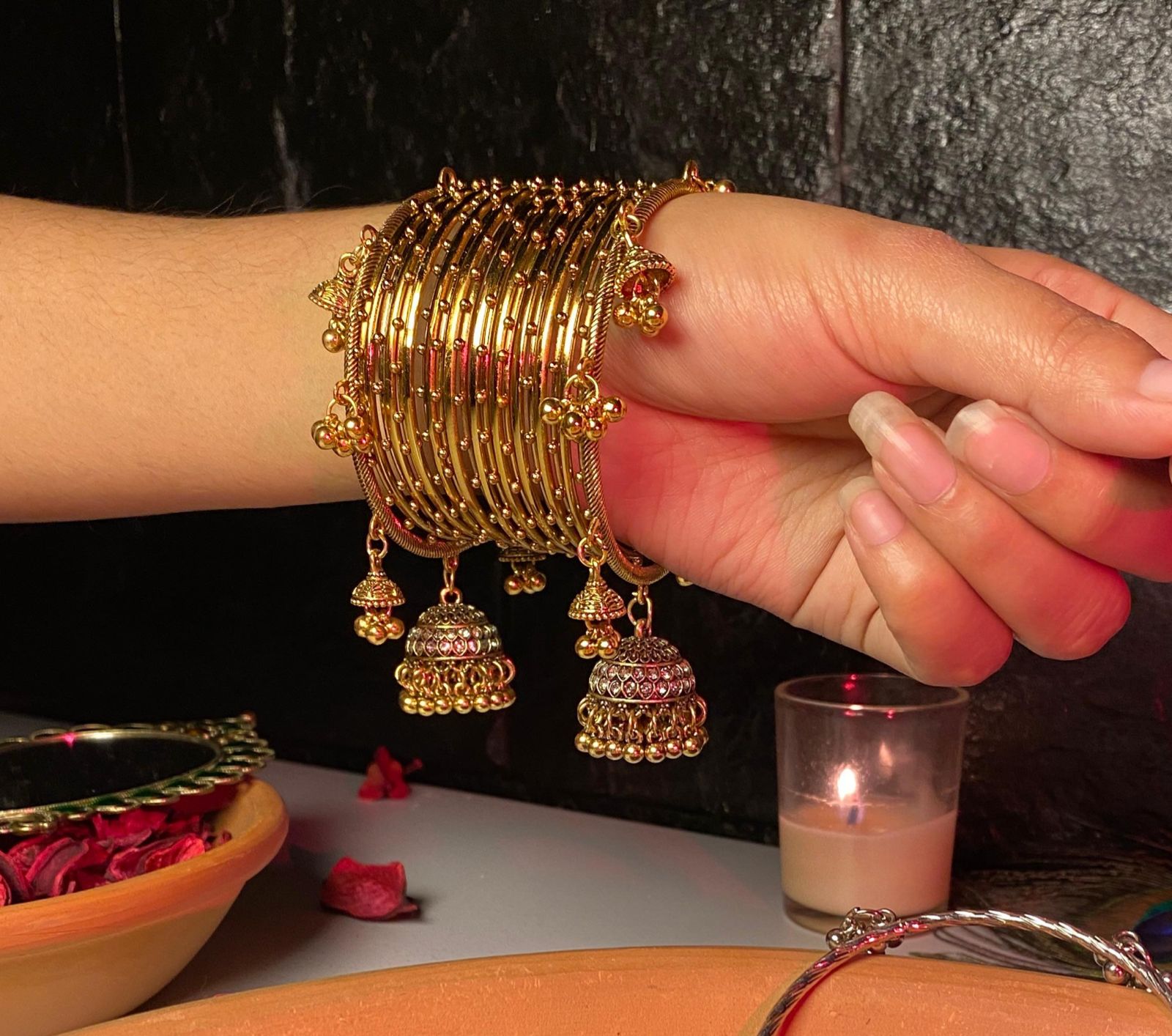 Enhance your outfit with these stunning golden steel bangles. Perfect for adding a touch of elegance and sparkle to any ensemble, these bangles are versatile enough to be worn casually or for a special occasion. Made with high-quality materials, these bangles are sure to become a staple in your jewelry collection.