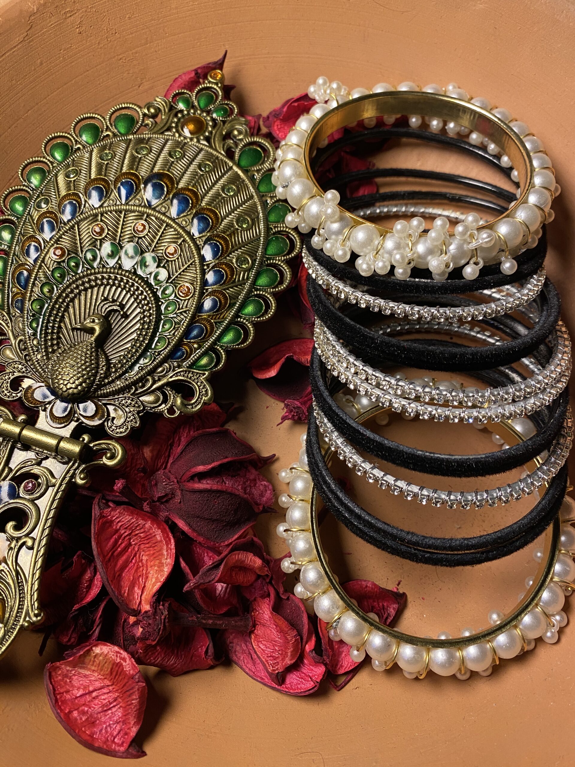 Enhance your outfit with these stunning pearl bangles. Perfect for adding a touch of elegance and sparkle to any ensemble, these bangles are versatile enough to be worn casually or for a special occasion. Made with high-quality materials, these bangles are sure to become a staple in your jewelry collection.